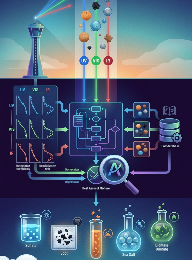ASSA, based on Siomos et al. (2020, 2021), uses multi-spectral Raman lidar data to separate aerosol species by simulating backscatter and depolarization profiles from aerosol mixtures in the OPAC database. It matches measured lidar and radiometric data to determine the best aerosol mixture. This flexible approach supports systems operating in UV/VIS/IR and incorporates hygroscopic growth effects.